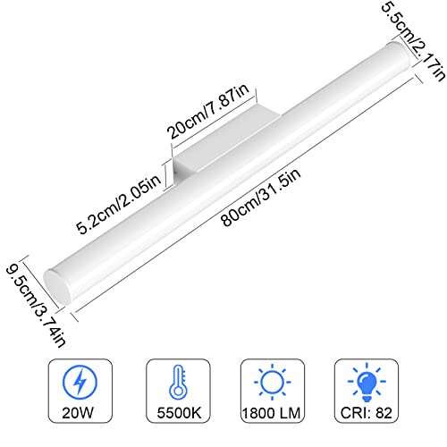 Klighten Luce Specchio Bagno Led 80cm, 20W 1800 Lumen, Impermeabile IP54 Lampada da Specchio Bagno Cilindrico, Applique Bagno Specchio Moderno Bianco, Bianco Freddo 5500K