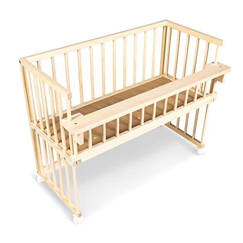 Klups Piccolino Baby Side Bed from Birth to 9 kg Extra Bed Free-Standing Baby Bed Also for Toddlers Height Adjustment Pine Wood Rubber Wheels with Blockage (Natural)