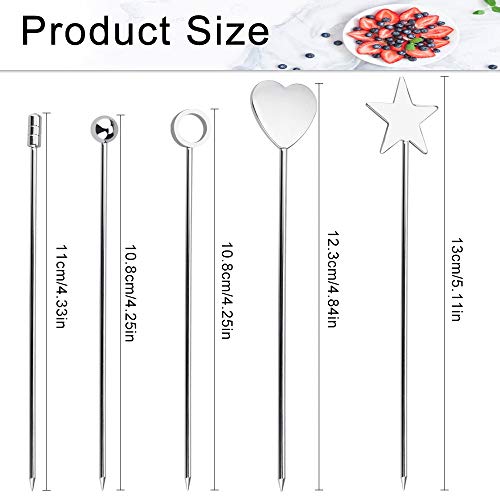 【6 diversi tipi】Ci sono 6 diversi tipi di bastoncini di frutta in metallo: cerchio, cilindro, sfera, quadrato, cuore e stella. Questi bellissimi spiedini da cocktail in acciaio inossidabile possono essere una buona decorazione per bevande e snack e non influenzano il gusto del cibo.