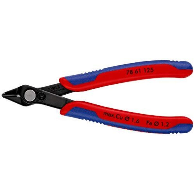 78 61 125 SB Electronic Super Knips Pinze particolarmente adatte per il taglio di alta precisone nell'elettronica e nella meccanica fine. Taglienti rettificati di precisione senza sfaccettatura. Taglienti di forma particolare adatti anche per tagliare fili metallici poco sporgenti da Ø 0,2 mm. Sezione di taglio con micro-spostamento dei taglienti controllato per un taglio ultrapreciso anche dei fili metallici più sottili e per una lunga durata. Articolazione con rivetto in acciaio legato. Funzionamento estremamente facile senza affaticamento della mano. Con molla di ritorno e delimitazione di apertura. adatti anche per il taglio di cavi in fibra di vetro (fibre ottiche). taglienti ulteriormente temperati ad induzione, durezza ca. 62 HRC. acciaio speciale per utensili, temperato ad olio a gradini. confezione self-service/blister. Valori di taglio filo di media durezza (diametro): Ø 1,2 mm Valori di taglio filo dolce (diametro): Ø 0,2 - 1,6 mm: 9 mm: 7,5 mm Larghezza testa (A): 13,5 mm