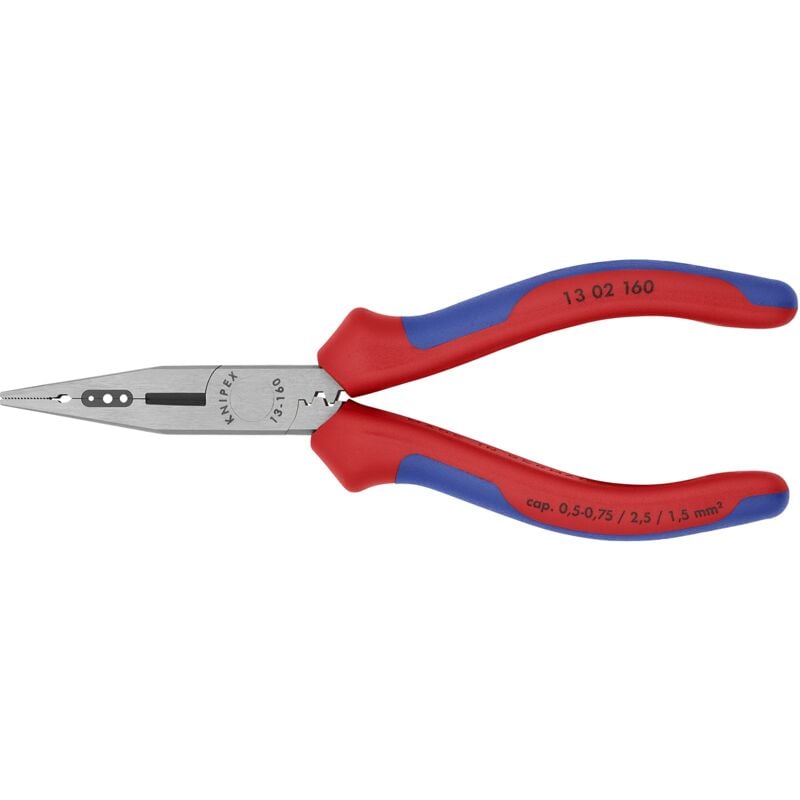 13 02 160 Pinza combinata per elettricisti e cablatori La pinza ideale per lavori di cablatura. Per serrare e piegare fili. Per tagliare fili duri e medio-duri. Taglienti di precisione ulteriormente temperati ad induzione, durezza dei taglienti ca. 60 HRC. Con fori spelacavi di precisione. Per crimpare terminali a bussola. Valori di taglio filo di media durezza (diametro): Ø 2,5 Valori di taglio filo duro (diametro): Ø 1,6 Valori di spelatura in millimetri quadri: 0,5 — 0,75 / 1,5 / 2,5 mm²