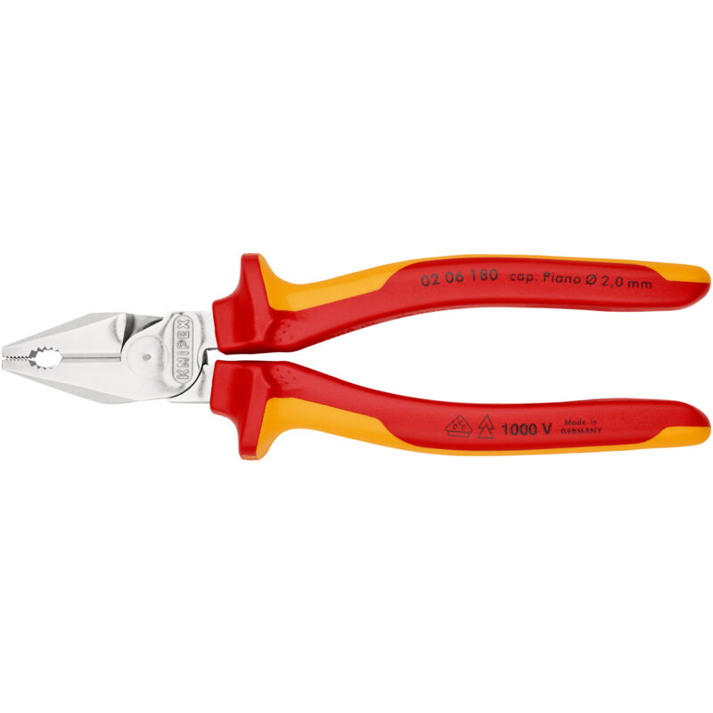 02 06 180 SB Pinza universale tipo forte 35 % meno sforzo rispetto alle tradizionali pinze universali. con taglienti (durezza circa 63 HRC) per impieghi più duri. Lavoro semplificato grazie al rapporto di trasmissione ottimizzato. Taglio facilitato, grande forza di presa, piegatura e trazione. Taglienti allungati per il taglio di cavi con diametri maggiori. Con zone di presa per materiale piano e tondo, per un impiego versatile. . Taglienti ulteriormente temperati ad induzione, durezza ca. 63 HRC. confezione self-service/blister. Valori di taglio filo duro (diametro): Ø 2,5 mm Valori di taglio filo armonico (diametro): Ø 2,0 mm Valore di taglio cavo Cu, a più fili: Ø 11,5 mm Valore di taglio cavo Cu, a più fili: 16,0 mm² collaudato VDE: sì