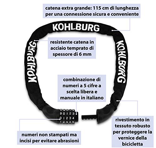 KOHLBURG lucchetto a combinazione molto lungo, 115 cm di lunghezza e 6 mm di spessore con codice numerico - lucchetto a catena con combinazione numerica - lucchetto di sicurezza per bicicletta