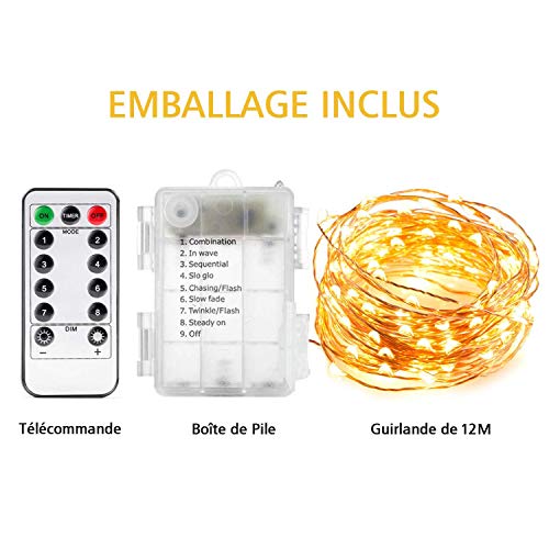 Kohree - Ghirlanda luminosa a LED, a pile, con filo in rame, 12 m, con telecomando, per matrimoni, feste, camere, ecc. BlancChaud