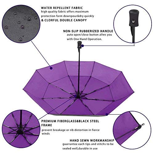 Koler Travel Umbrella Windproof Auto Open Close Large Sized Double Canopy Waterproof & Sunproof 46 Inch Oversized Folding Umbrellas - Black/Purple
