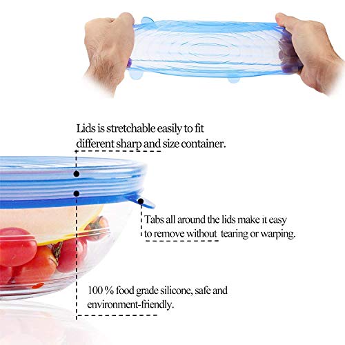 Diverse misure e riciclatura: per soddisfare le esigenze dei diversi clienti, il coperchio estensibile in silicone include diverse dimensioni bianche e blu, compatibili con ciotole, barattoli, vetro, prodotti in vetro, coperchi alimentari, in lavastoviglie, in forno a microonde e in freezer Totale di 6 pezzi per set: 2,6 ", 3,8", 4,5 ", 5,7", 6,5 "e 8,3".
