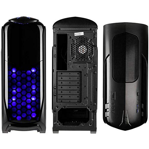 ✔️ ILLUMINAZIONE: due ventole blu da 120mm preinstallate illuminano una superficie a maglie a nido d'ape dietro una copertura in acrilico con archi. Questa finestra si fonde in un flip-flop nero brillante, dietro il quale si trovano i telai per due unità esterne da 5,25 pollici e uno da 3,5 pollici.