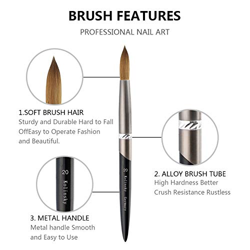 Kolinsky, pennelli per unghie in acrilico, pennello professionale per nail art, gel UV, forma rotonda, per principianti, in polvere acrilica, manicure e pedicure, manico in metallo (misura 20)