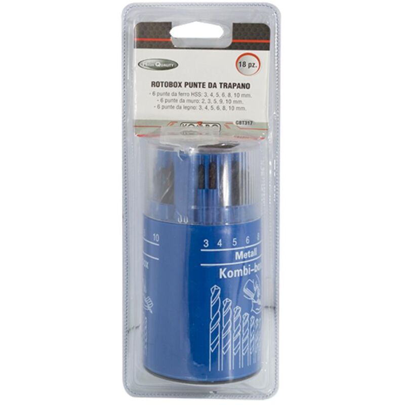 KOMBO - Rotobox in Plastica con Coperchio Girevole Punte da Trapano 18 pz. Per legno muro e ferro Accessori e Ricambi Utensili Elettrici