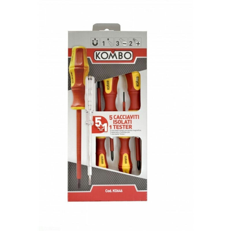 SET CACCIAVITI ISOLATI E TESTER KOMBO 'KO646' Set composto da 5 cacciaviti isolati 1000V ed 1 tester. PRODOTTO A NORMA VDE DIN EN 60900 (VDE0682-201):2013-04 + EN 60900:2012. Caratteristiche Misure: SL misure: 2,5x50 mm - 3,5x75 mm - 5,5x150 mm PH misure: 1x80 mm - 2x100 mm Tester