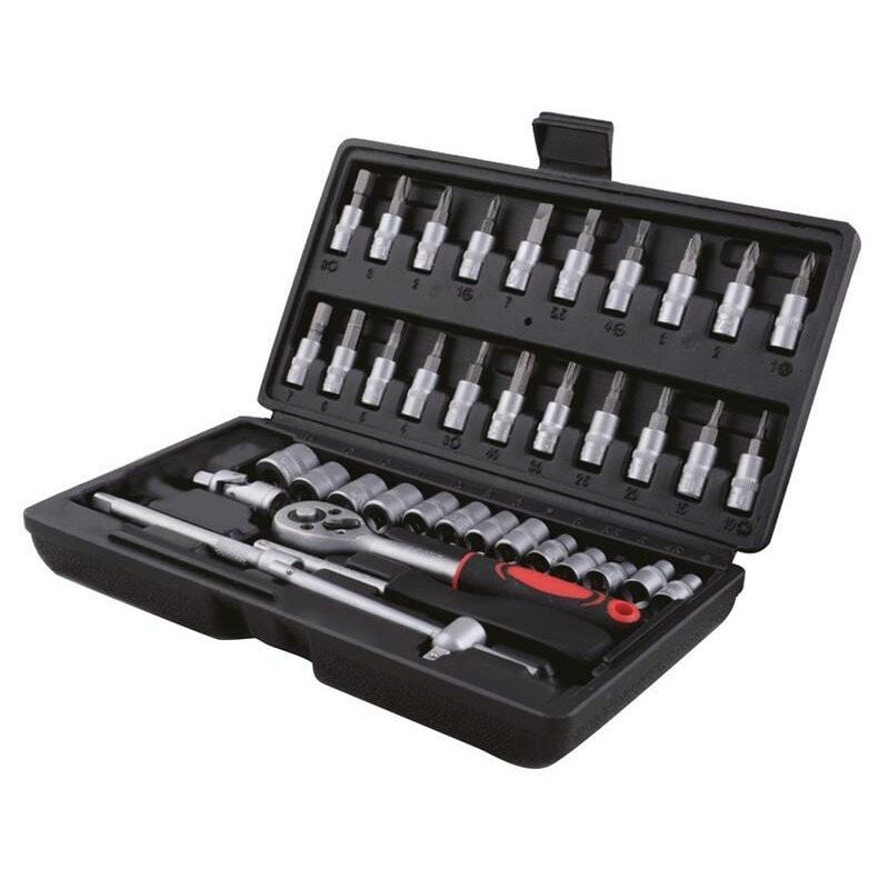 Set realizzato in acciaio Cr-V con finitura lucida a specchio. 41 accessori per lavori professionali e fai da te. Munito di resistente astuccio per rimessaggio. 1 chiave a cricchetto reversibile 72 Denti 21 inserti 13 Bussole 1/4 1 estensione 1/4 lunga 10 Cm 1 Barra a T regolabile 1 estensione a snodo 1/4 1 Estensione magnetica 1/4 1 Astuccio BMC richiubile