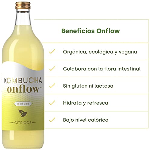 Kombucha Onflow - Tè Kombucha Gusto Agrumi - Confezione da 4 x 1 Litro - Bevanda Vegana, Ecologica e Organica - Elimina le Tossine - Tè Kombucha a Base di SCOBY - Prodotto in Spagna
