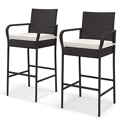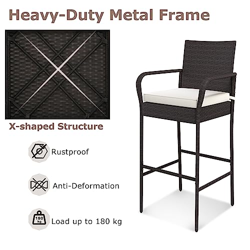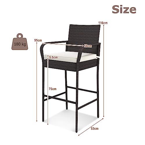 KOMFOTTEU Sgabello da Bar in Rattan, Sgabello da Bar con Schienale e Braccioli, Sgabello da Bistrot con Cuscino, Sgabello da Banco fino a 180 kg Caricabile per Giardino Balcone Terrazza, 4 pz (2)