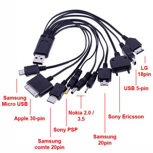 Il cavo di ricarica USB è dotato di 10 connettori compatibili con molti telefoni cellulari.