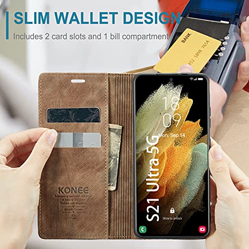 KONEE Custodia Compatibile con Samsung Galaxy S21 Ultra, [Slot per schede] [Funzione Stand] Pelle Premium Magnetica Flip Antiurto Portafoglio PU Cover per Samsung Galaxy S21 Ultra 5G - Marrone