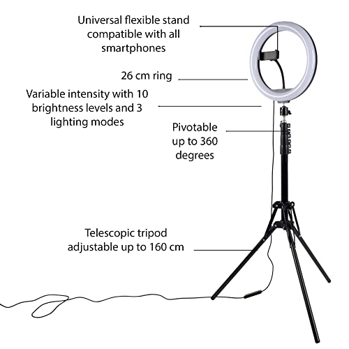 L'anello di luce LED da 26 cm ha un'intensità variabile con 10 livelli di luminosità e 3 modalità di illuminazione (freddo, naturale e caldo) per regolare la luminosità e la tonalità in base alle proprie esigenze.