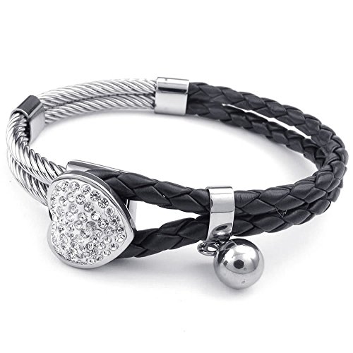 KONOV Gioielli Bracciale da Donna, Cuore Charm Intrecciato Braccialetto, Pelle Acciaio Inossidabile, Nero Argento (con Borsa Regalo)