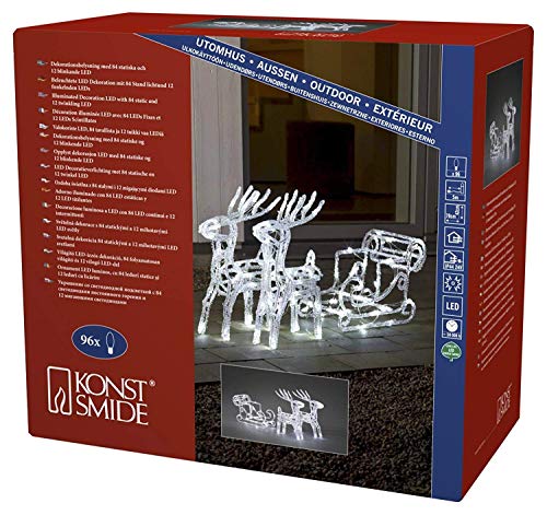 Konstsmide, Statuetta LED in Acrilico, Soggetto: Slitta con 2 Renne, 96 luci fisse e 12 Lampeggianti, trasformatore Esterno 24 V, Cavo Trasparente, 6192-203