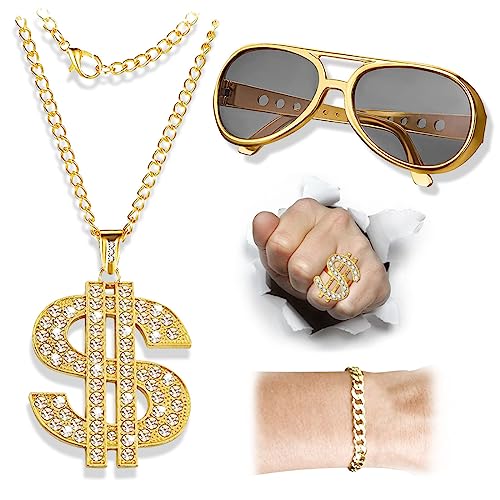KOOKZ Set Accessori Rapper Costume Hip Hop, Collana Dollaro, Occhiali Rapper, Anello Dollaro, Bracciale Rapper, Costume Anni 80 90 per Feste e Carnevali