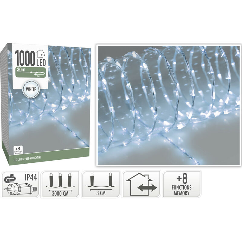 LUCI DI NATALE 1000 LED LUCE FREDDA CAVO TRASPARENTE Luci di Natale 1000 led luce fredda cavo trasparente è una luminaria ideale per decorazioni interne ed esterne di alberi di Natale, ghirlande di Natale, siepi, balconi e vetrine. Durante il periodo natalizio le luci di Natale rivestono un ruolo fondamentale per rendere ancor più scintillante la propria abitazione. Le luci natalizie non possono mancare in ogni creazione o addobbo di Natale sia dentro che fuori casa. Le luci di Natale 1000 led luce fredda possiedono il cavo trasparente ideale per essere nascosto tra i rami dell' albero di Natale bianco o innevato, tra i festoni o corone. All'esterno questa tipologia di luce viene spesso utilizzata per decorare le siepi o piccoli arbusti. Le luci di Natale sono particolarmente fitte e luminose grazie alla distanza di soli 3 cm tra un bulbo e l'altro. Questo rende questa tipologia di luminaria natalizia particolarmente adatta per illuminare ramo per ramo l'albero di Natale. Il cavo