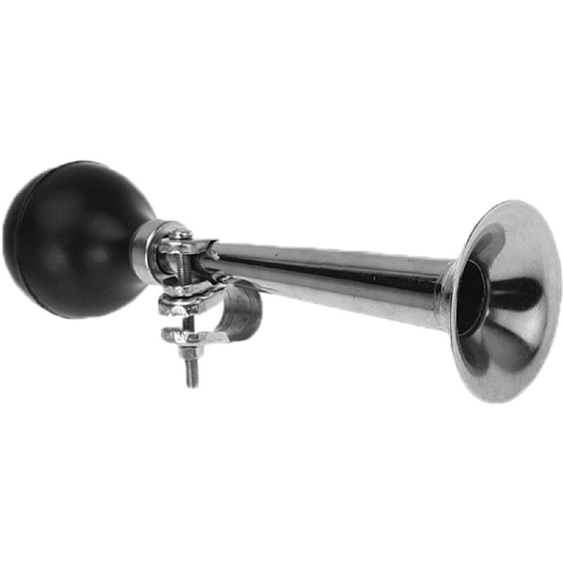 A forma di tromba dal design classico. Realizzata in gomma nera e tromba in metallo cromato. Si fissa al manubrio della bicicletta tramite rondella. Corno in metallo.