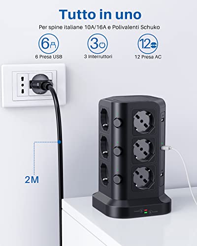 KOOSLA Ciabatta Elettrica con 12 Prese Universali ITA 10/16A e Schuko e 6 slot USB-A(4000W/16A), Multipresa verticale protezione sovratensione con 3 interruttori indipendenti, 2M Cavo, Nero