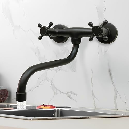 KOPYFANTAP Rubinetto Cucina a Muro Nero,Girevole 360° Doppia Manopola Parete Miscelatore Cucina Ottone Rubinetti da Muro Cucina Caldo e Freddo,Braccio Girevole Lungo 20 cm