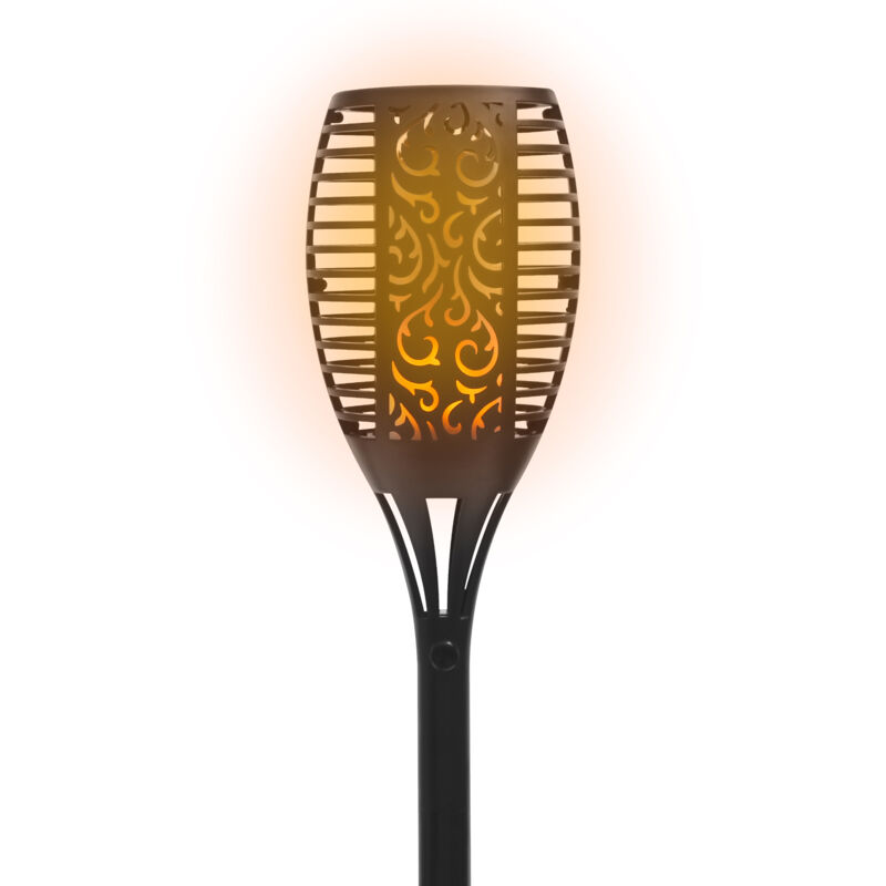 Torcia ricaricabile con luce solare. Batteria al litio da 300 mAh/1,2 V. Sensore crepuscolare integrato. Design elegante con fiamma effetto. 12 ore di luce con una carica completa. Tempo di ricarica completa: 6 ore. Protezione IP65 per uso esterno.
