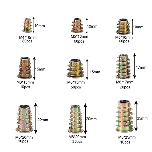 KOSHIFU 325 Pezzi Boccole Filettate per Legno Inserti Filettati Legno M4 M5 M6 M8 Assortimento Dadi Esagonali in Lega di Zinco per Mobili in Legno Dado di Inserto Filettato ad Inserto Kit