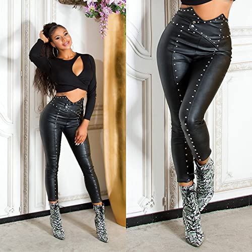 Koucla Pantaloni a vita alta in ecopelle, con borchie decorative, Nero, S