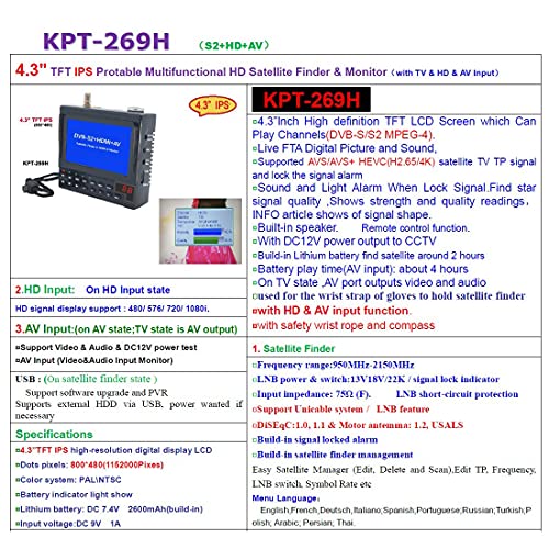 Schermo LCD TFT ad alta definizione da 4,3" che può riprodurre canali (DVB-S/S2 MPEG-4). Ingresso HD: sullo stato di ingresso HDHDHD, supporto del segnale 480/576/720/1080i.