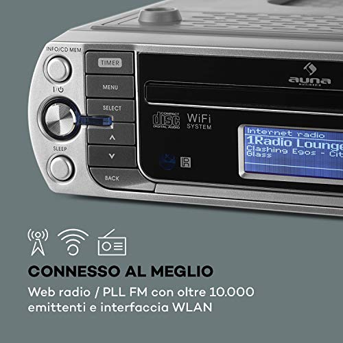AUNA KR-500 CD - Radio da Cucina, Sottopensile, Internet, Lettore CD / MP3, Connessione PLL, FM, Wi-Fi, AUX, USB, Spotify Connect, Streaming di Rete, Argento Scuro