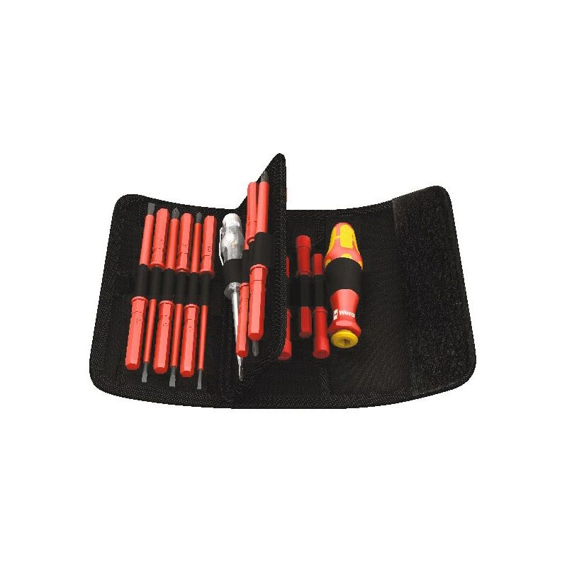 Impugnatura Kraftform con lame intercambiabili lunghe 154 mm (incluse chiavi per quadri elettrici) completamente isolate fino a 1000 Vsecondo le norme DIN EN IEC 60900 / VDE 0682-201 e un rilevatore di tensione (fino a 250 V secondo la norma VDE 0680/6) disponibili in una robusta borsa pieghevole in tessuto con chiusura a strappo e passante per cintura. Contenuto: Lame per viti a intaglio: 0,4×2,5;