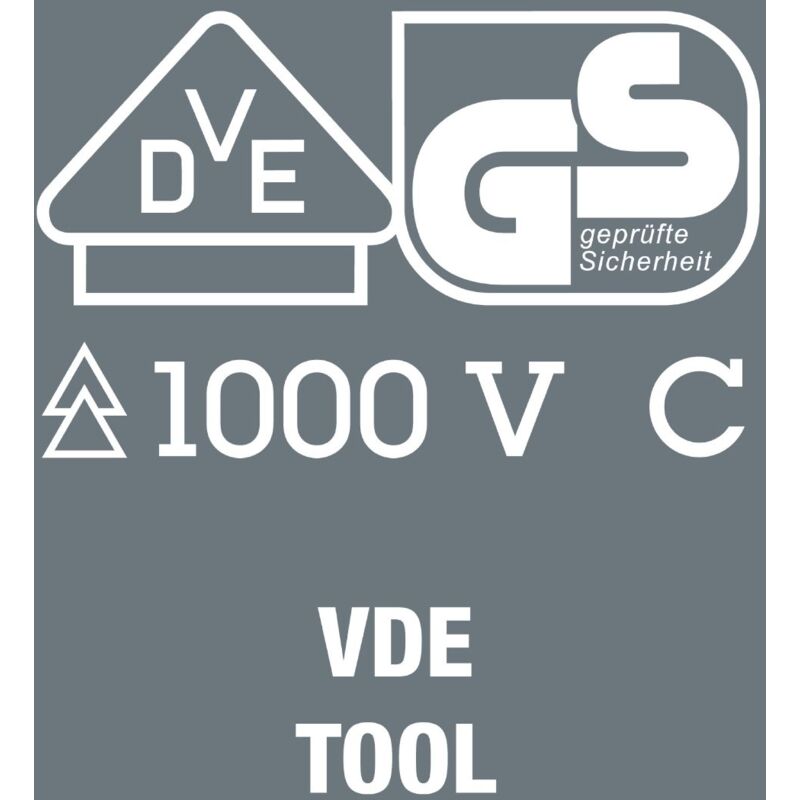 Lama VDE per una forma di forza, sistema di impugnatura compatta per una sostituzione rapida della lama senza attrezzi speciali. Utensili testati secondo IEC 60900. Testamento a bagnomaria a 10.000 V per lavorare in sicurezza con tensione approvata di 1.000 V.
