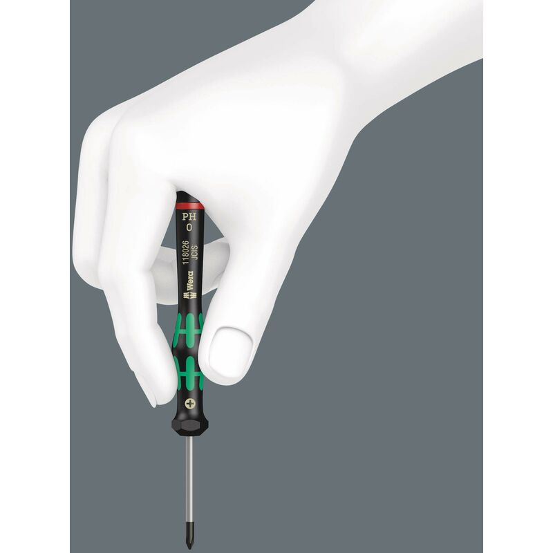 Micro cacciavite a taglio Wera Kraftform Ridurre notevolmente i tempi di fissaggio e i costi di applicazione delle viti. Questo era l'obiettivo nello sviluppo del micro cacciavite Kraftform per i settori dell'elettronica e dell'ingegneria leggera. Larghezza della punta: 2.5 mm