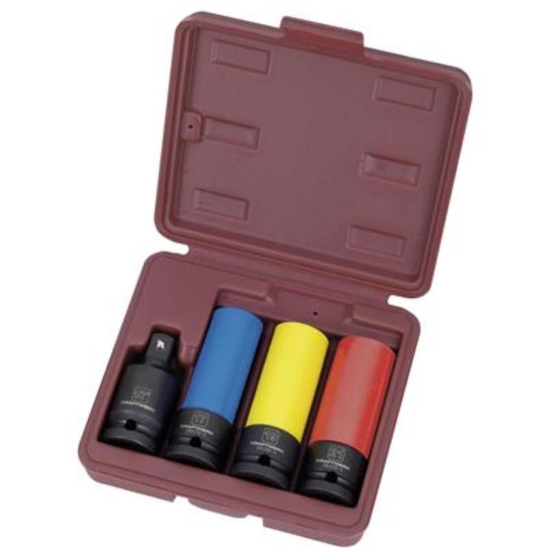 3083 frase di tasca per impatto 1/2 4 parti. per cerchi in alluminio. 3 pezzi di 1/2 dadi di punzonatura per cerchi in alluminio. Extra lungo con rivestimento in plastica come protezione del bordo in alluminio e inserto in plastica interno come protezione delle viti della ruota. Compreso un adattatore giunto sorprendente 1/2. Tutti gli inserti a chiave socket sono chiaramente e pronti per andare in una scatola.