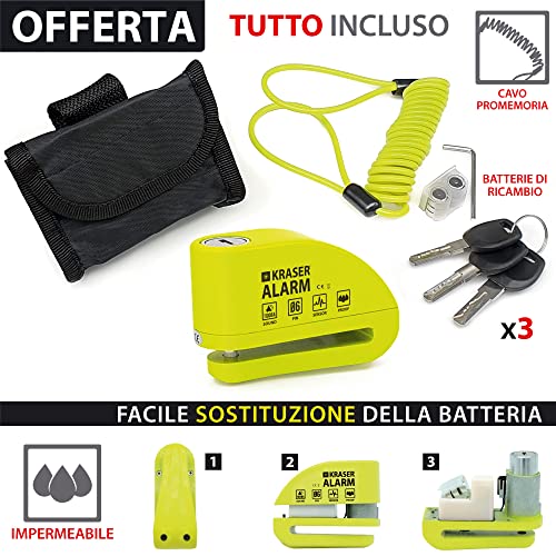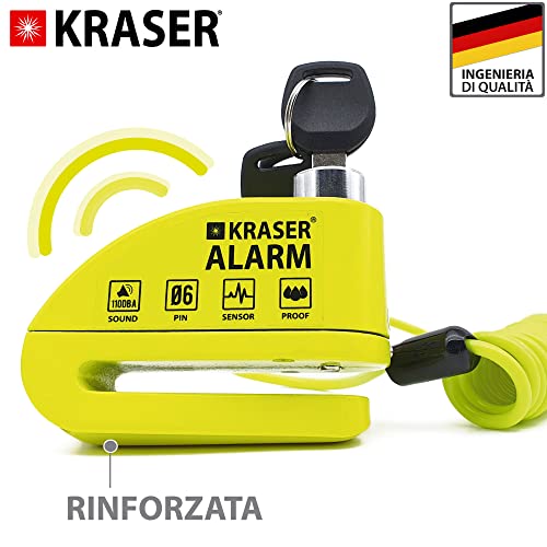 KRASER KR6Y Antifurto Moto Allarme Lucchetto Bloccadisco Certificazione, Reminder Cavetto + Borsa Trasporto, Blocco Disco Avviso Universale Motocicletta Scooter Bicicletta Monopattino Elettrico, 110dB