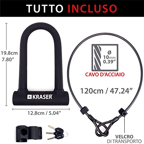 KRASER KR65145B Lucchetto a U per Bici Antifurto Bicicletta 16mm Acciaio D Lock Grillo Serratura Sicurezza Monopattino Cavo in Acciaio 4ft Lunghezza Staffa di Montaggio Universa Blocco a U Rivestito