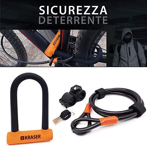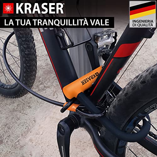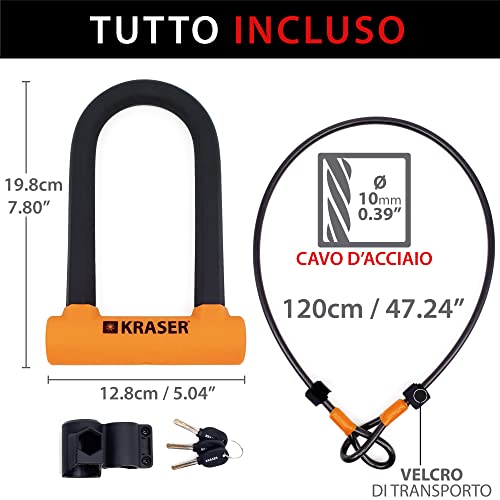 KRASER KR65145N, Lucchetto a U per Bici Universale Alta Sicurezza + Cavo Flessibile Acciaio 120cm + Staffa Unisex-Adult, Nero e Arancio, Standard