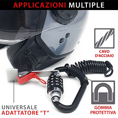 KRASER KR723B Moschettone Casco Moto, Lucchetto Bici Antifurto Codice Combinazione Motociclo, Cavo in Acciaio, Adattatore Barra T Chiusura a Fibbia, Serratura Armadietto Bagagli Multifunzione