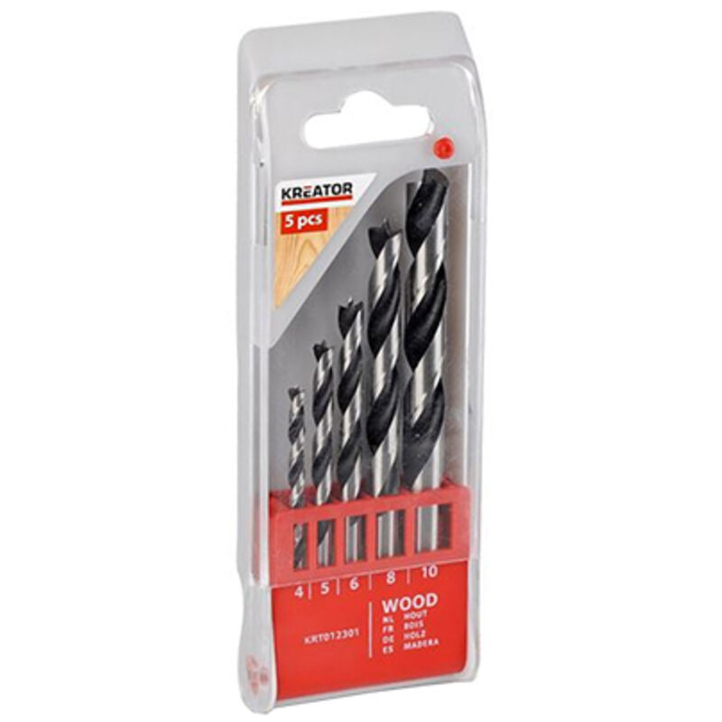 Set 5x Punte Trapano per Legno | Kreator KRT012301 Il set include 5 punte trapano per legno, in custodia rigida. Diametri: 4 - 5 - 6 - 8 - 10 mm Materiale: Metallo