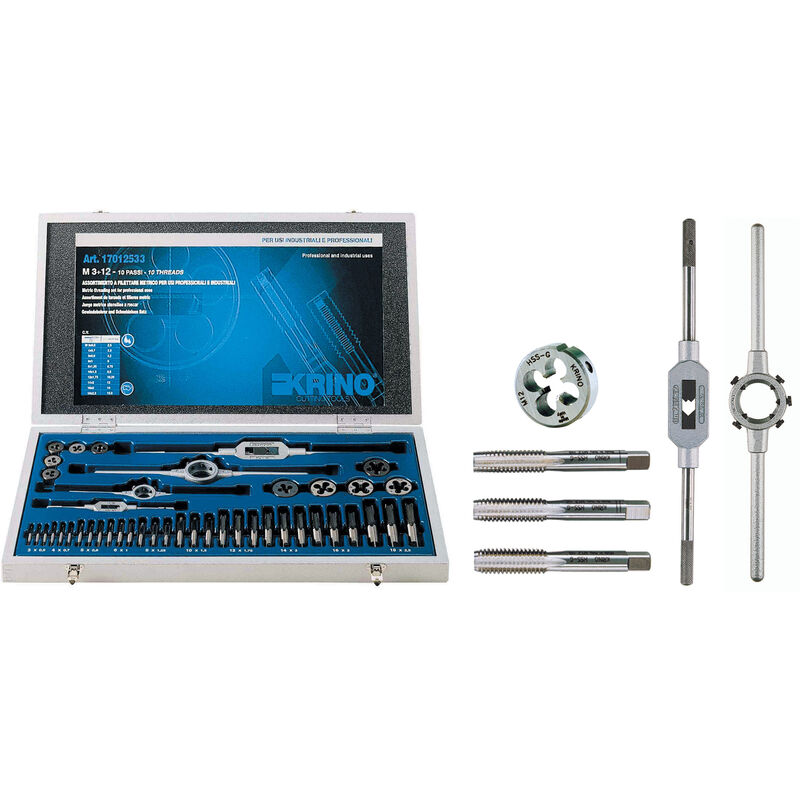 In acciaio al cromo vanadio. Filettatura metrica ISO - passo grosso. Composto da: - maschi a mano in serie da 3 pezzi - filiere tonde regolabili Per filettare 3 12MA