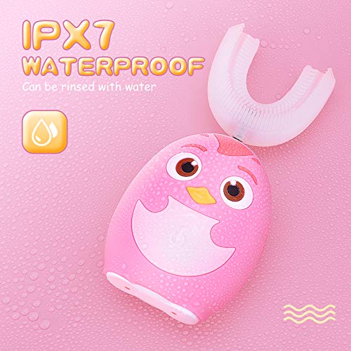 Kriogor - Spazzolino da Denti Elettrico per Bambini, a Prova di Acqua, IPX7, a Forma di U, in Silicone, Spazzolino da Denti Intelligente, Ricaricabile USB, con 3 Funzioni (2-6 Anni-Rosa)