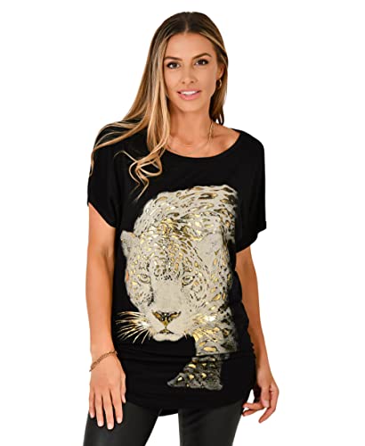 KRISP - Maglietta da donna con stampa leopardata, top lucido, stile casual, taglie grandi Nero 40