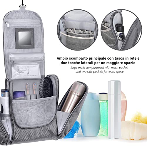 KRONIFY Grande Borsa da Toeletta Premium Appesa con Specchio | Beauty Case Uomo e Donna | Porta Trucchi Organizer da Viaggio | Spaziosa Borsa da Toilette con Gancio | Borsa da Lavaggio | Grigio