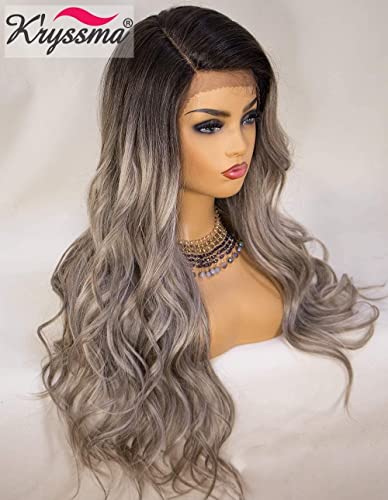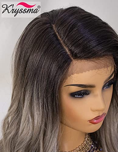 Kryssma Parrucche anteriori in pizzo grigio Ombre con parte laterale profonda lunga parrucca ondulata sintetica 130% densità per le donne resistente al calore 22 pollici