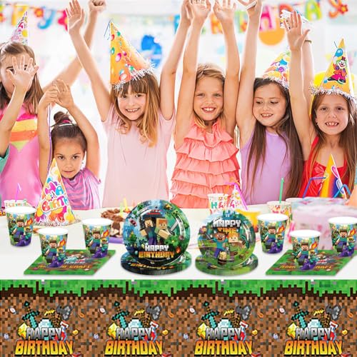 Ksopsdey 69PCS Mi-necraft Party Decorazioni,Mi-necraft Stoviglie per Feste,Set di Stoviglie di Compleanno per Bambini,Piatti,Tazze,tovaglioli,tovaglie,Decorazioni di Compleanno,16 Persone