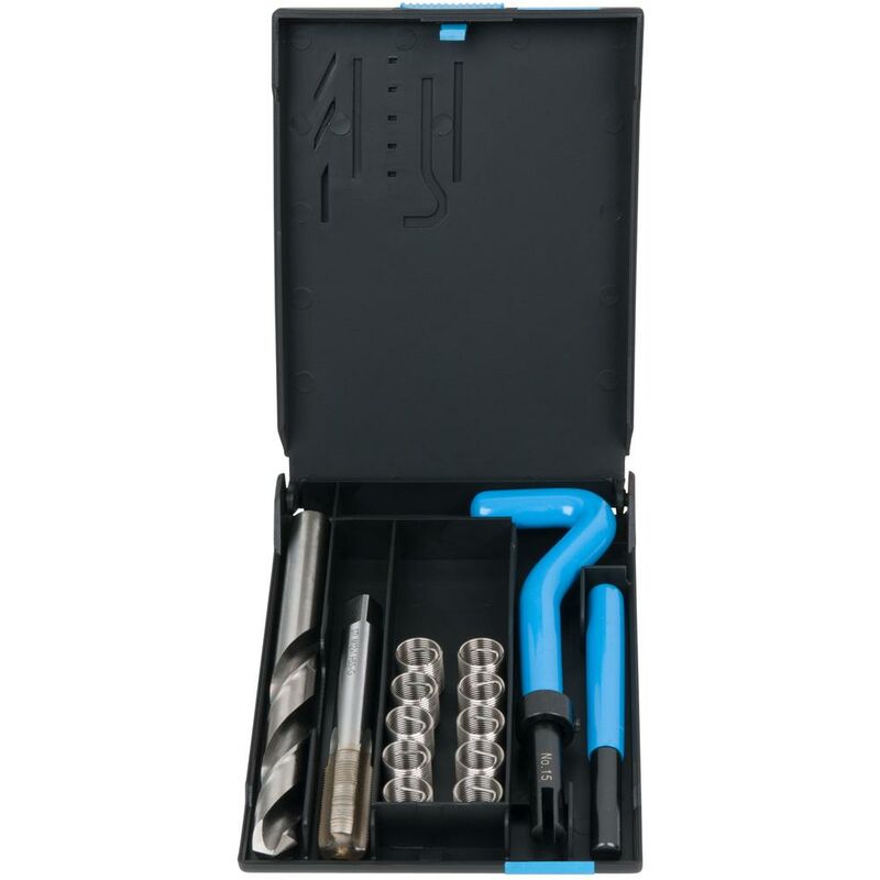 Assortimento unico di attrezzi per la riparazione di filettature danneggiate o usurate Di facile utilizzo per una riparazione professionale Sedi degli inserti particolarmente robuste e a tenuta ermetica Inserti particolarmente sottili in acciaio inox Maschio per filettare e utensile per montaggio inclusi Possibilità di una riparazione veloce senza necessità di immagazzinare molte parti di ricambio In robusta cassetta metallica