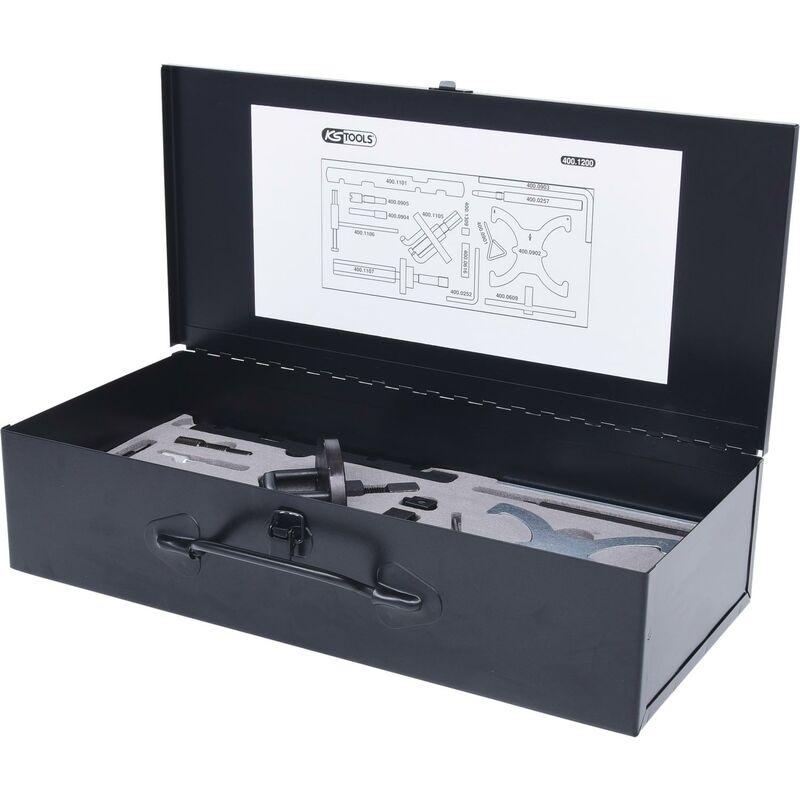 Per la riparazione professionale del motore Set di ampliamento per l'impiego in combinazione con 400.0600 Per il bloccaggio dell'albero a gomito o dell'albero camme Per la sostituzione della puleggia dentata Elevata adattabilità In robusta cassetta metallica Campi di applicazione: Ford Focus, C-Max con motori 1,6 Ti VCT, Fiesta, Fusion con motori 1,4 / 1,6 TDCi, Mondeo, S-Max, Transit Connect, Tourneo Connect con motori 1,8 TDdi / TDCi e 2,0 TDCi (Motorcode: HXADA)