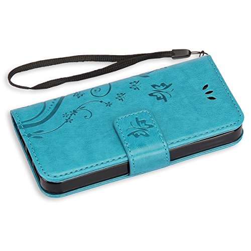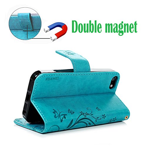 KUAWEI Custodia iPhone 5 SE 5S Flip Cover Wallet Case Custodia in Pelle con Magnetico Snap-on,Carte Slot Credito,Portafoglio,Supporto Stand,Book Style,Goffratura Arts Farfalla Fiore Design (Azzurro)
